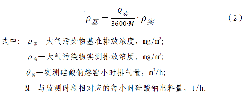 六、增加4.2.8 條,內(nèi)容為:純氧燃燒硅酸鈉熔窯應(yīng)監(jiān)測排氣筒中大氣污染物排放濃度、排氣量及相應(yīng)時間內(nèi)的硅酸鈉出料量,按式(2)換算為基準(zhǔn)排氣量(3600 m3/t 硅酸鈉)條件下的大氣污染物基準(zhǔn)排放濃度,并以此作為達(dá)標(biāo)判定依據(jù)。大氣污染物排放濃度、排氣量、產(chǎn)品產(chǎn)量的監(jiān)測、統(tǒng)計周期為1 h,可連續(xù)采樣或等時間間隔采樣獲得大氣污染物排放濃度和排氣量數(shù)據(jù),硅酸鈉出料量數(shù)據(jù)以企業(yè)統(tǒng)計報表為依據(jù)。